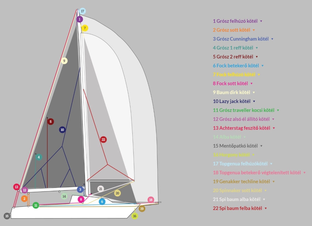 Legyen szó reff kötelekről, segédkötelekről vagy speciális felhasználásról, a Kötélválasztó ábránkon minden fontos kötél a helyén van feltüntetve, egyértelmű ajánlással.